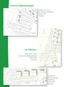 Zusätzlich zu den 14 Parzellen am Bröckerweg : Berningshöhe, Abendrot, Hammersenstr., Waldfrieden, Bröckerweg, Morgensonne, Sonneneck, Vogelsang, Paradies I und II, Nahne I und II, Wiesengrund I und II. (wo sich auch unser Vereinsheim sowie das Schreberstübchen befinden) gibt es weitere 9 Parzellen im Außenbereich: Bergerskamp I und II , Spiegelkamp, Klushügel, Langenkamp I und II, Weddendorf, Schölerberg I und II.